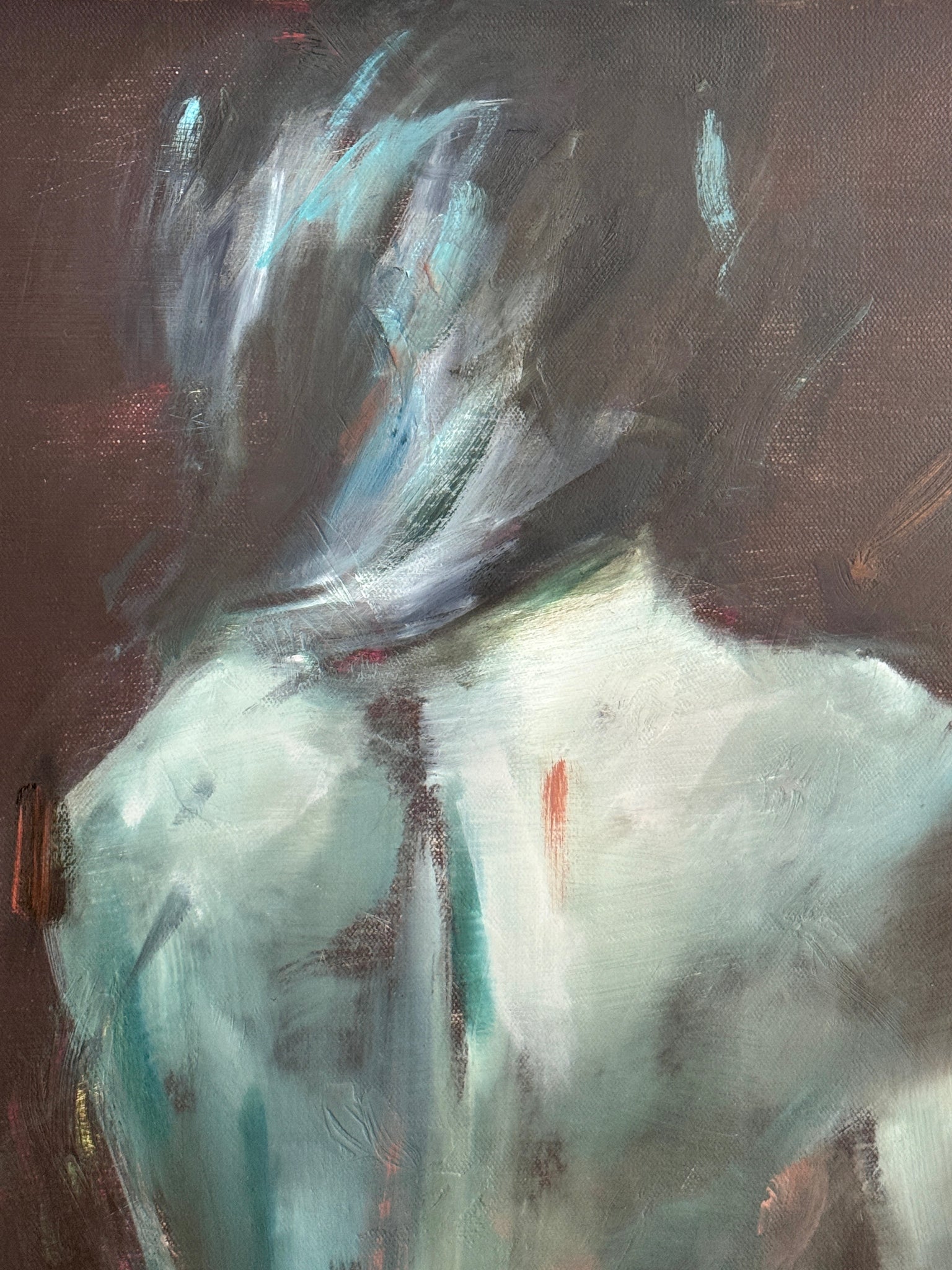 Detail view of Anaïs by Roberta Heslop — highlighting expressive brushstrokes and the texture of layered oil paint in earthy green and brown tones.